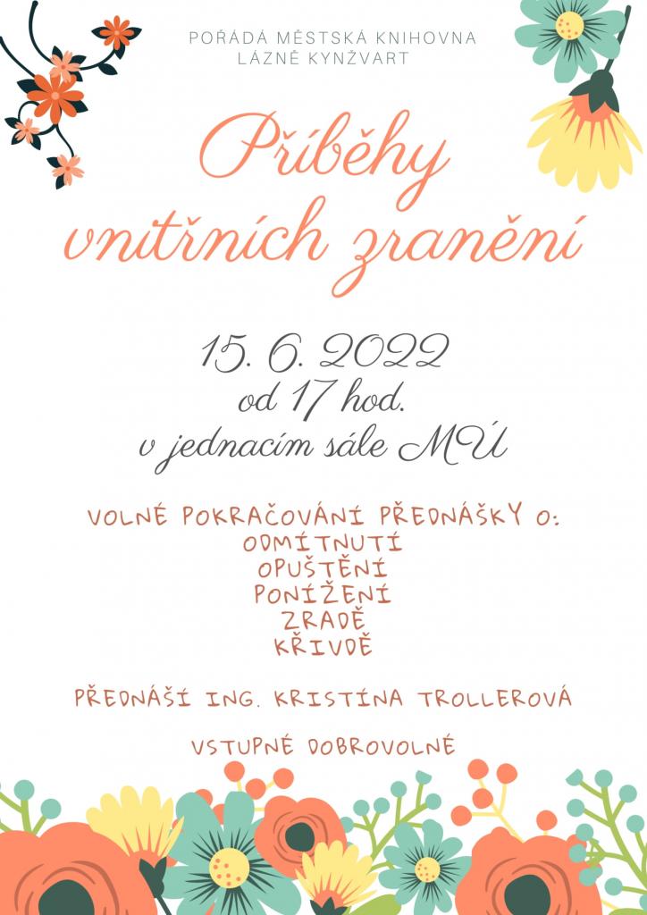 Zveme vás na pokračování přednášky paní Ing. Kristíny Trollerové na téma Vnitřní zranění ve středu 15. 6. 2022 do Zasedací místnosti Měú Lázně Kynžvart od 17 hodin. Vstupné je dobrovolné. Těšíme se na vás!